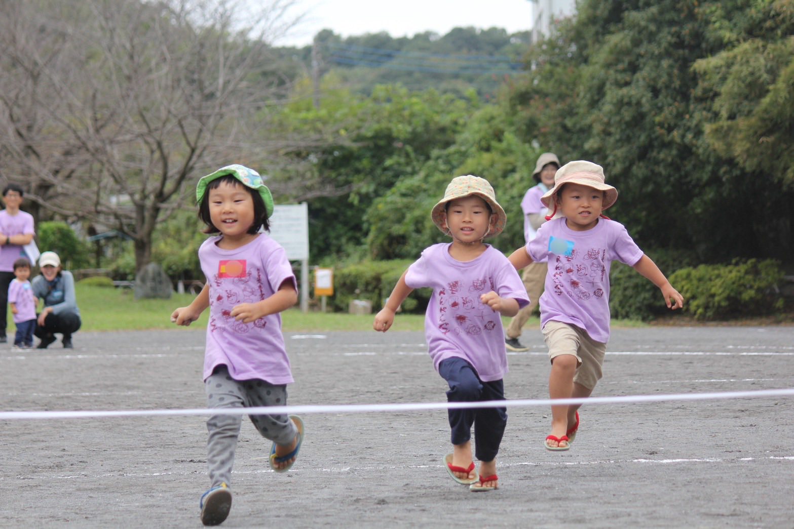 いくよー‼︎いちについてー!と、スタートラインのみえこさんが年少たちに呼びかけました。